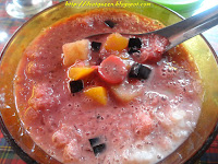 Terakhir Raka penasaran dengan rasa es Johor ( Rp 17,000). Yang aku lihat, semacam es campur. Ini tuh, es serut dituangi susu kental manis dan sirup, lalu di dalamnya ada potongan-potongan cincau, peach, apel, dan buah-buahan segar lain. Refreshing diminum saat hari panas terik seperti cuaca Medan kala itu.