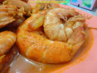 Udang Setengah kilogram, dimasak saos padang. Awalnya mikir, palingan udang kecil-kecil yang dimasak. Tapiiiiiii terhampar di depan mata pemandangan sexy si udang montok dengan size gede, dan banyaaaak ^o^. Rasa saos Padangnya, no debat, salim dulu ama pak chef! Sungguh pamali menyisakan udang seenak ini saat makan. Semua kami lahap, termasuk menghisap kepalanya yang sering masih ada printilan daging ;p . Harga udang gede setengah kilo, hanya Rp 100,000 cuuuuuy ^o^.