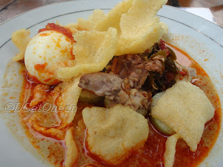 Begitu pesanan datang, sepiring lontong sayur ala Medan langsung tersaji. Keliatan enaaakkk ^o^ !!! Telur baladonya bulat utuh, kuah lontongnya gurih dan pedas, juga serundeng kelapa yang ditaburkan di atas kuah, khasnya lontong sayur yang dijual di Medan dan Aceh.