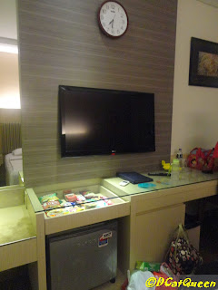 Kamar kami walau ga terlalu luas, tapi masih bisa dibilang lega. Yang penting ada jalur untuk Fylly lari-lari di kamar setelah stress seharian di mobil ;p. Yang paling asik TV nya, dengan layar 42 inch, puas banget nonton semua acara tv cable, terutama untukku yang mata minus parah dan kacamata lupa bawa.